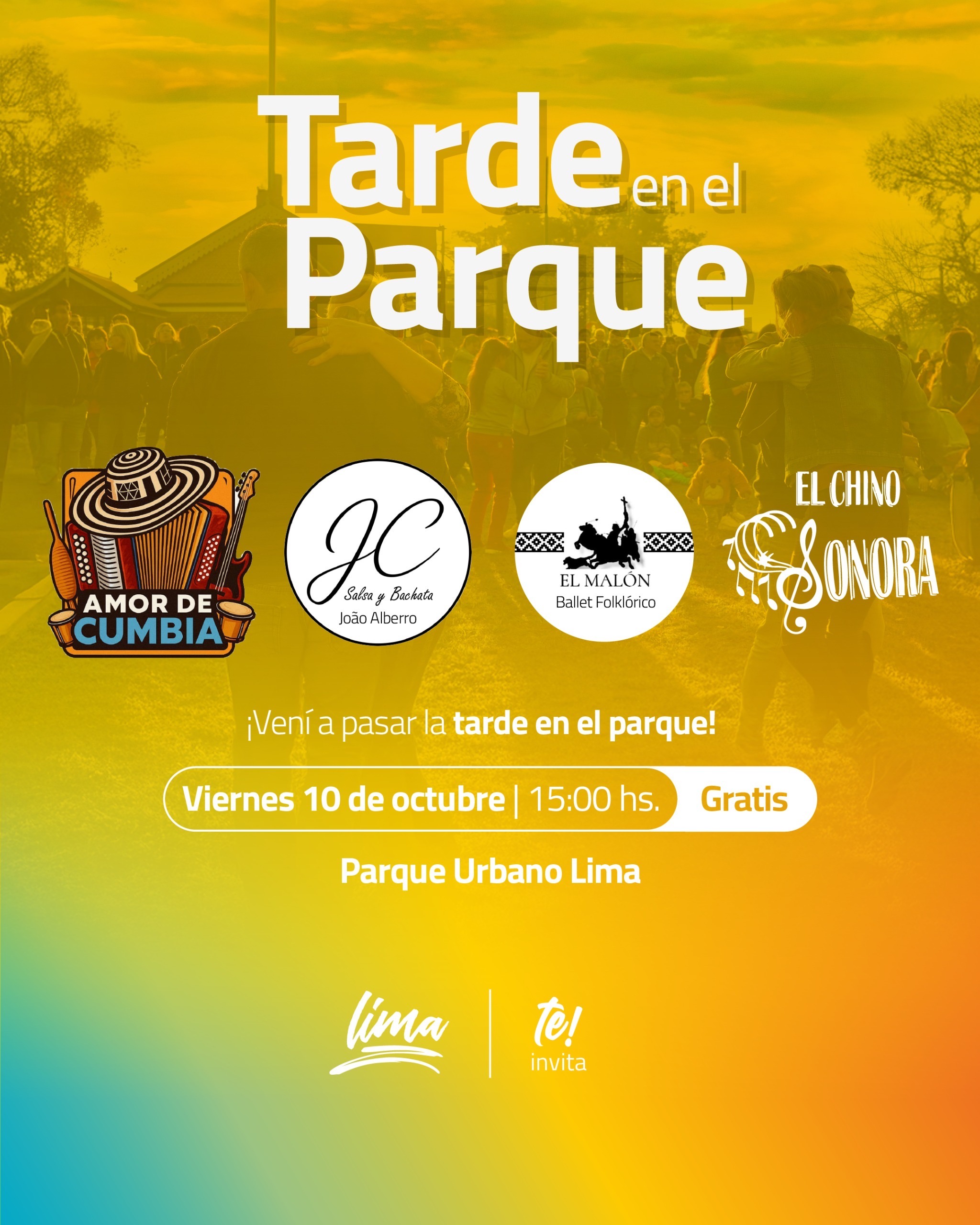 El viernes 10 de octubre, desde las 15 hs, en el Parque Urbano de Lima, se llevará a cabo una jornada gratuita para toda la familia con shows en vivo: Amor de Cumbia, Salsa y Bachata (Joao Alberro), El Malón Ballet Folklórico y El Chino Sonora.