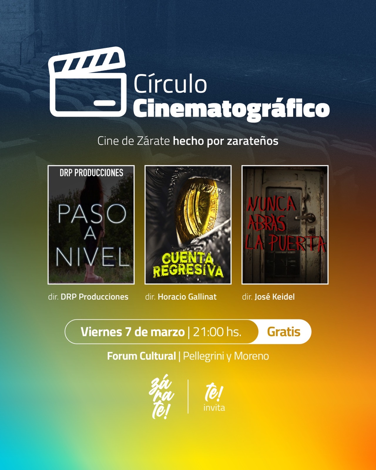Este viernes 7 de marzo a las 21 hs en el Forum Cultural (Pellegrini y Moreno) se realizará un ciclo de cine de Zárate hecho por zarateños que contará con la proyección de los cortometrajes “Paso a nivel” de DRP Producciones, “Cuenta Regresiva” de Horacio Gallinat y “Nunca Abras la Puerta” de José Keidel.