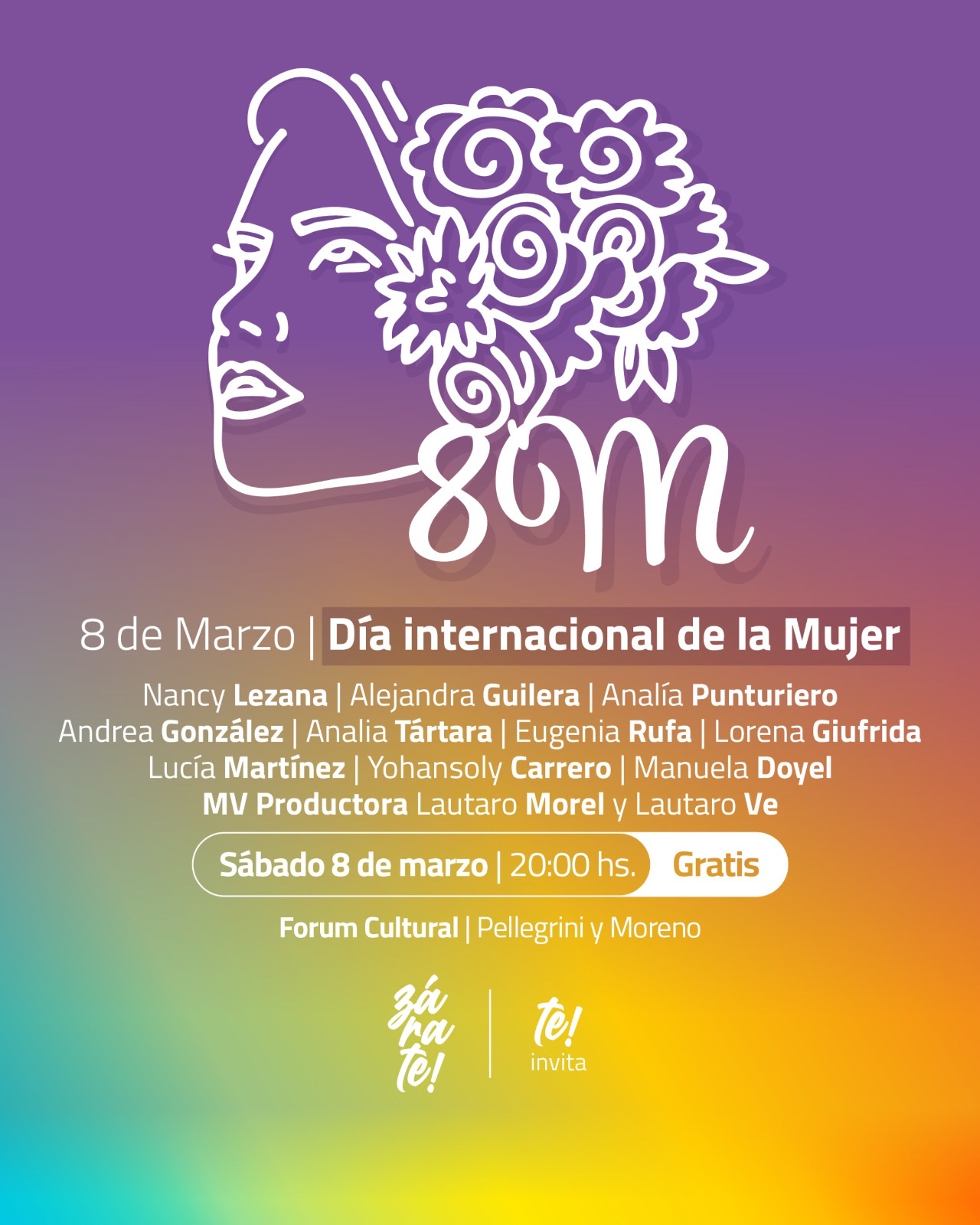 En el marco del Día Internacional de la Mujer, el sábado 8 de marzo a las 20 hs en el Forum Cultural se realizará un evento especial para reconocer y celebrar la lucha y el talento de las artistas locales. Estarán: Nancy Lezana, Alejandra Guilera, Analía Punturiero, Andrea González, Analía Tártara, Eugenia Ruffa, Lorena Giufrida, Lucía Martínez, Yohansoly Carrero, Manuela Doyel, MV Productora con Lautaro Morel y Lautaro Ve.