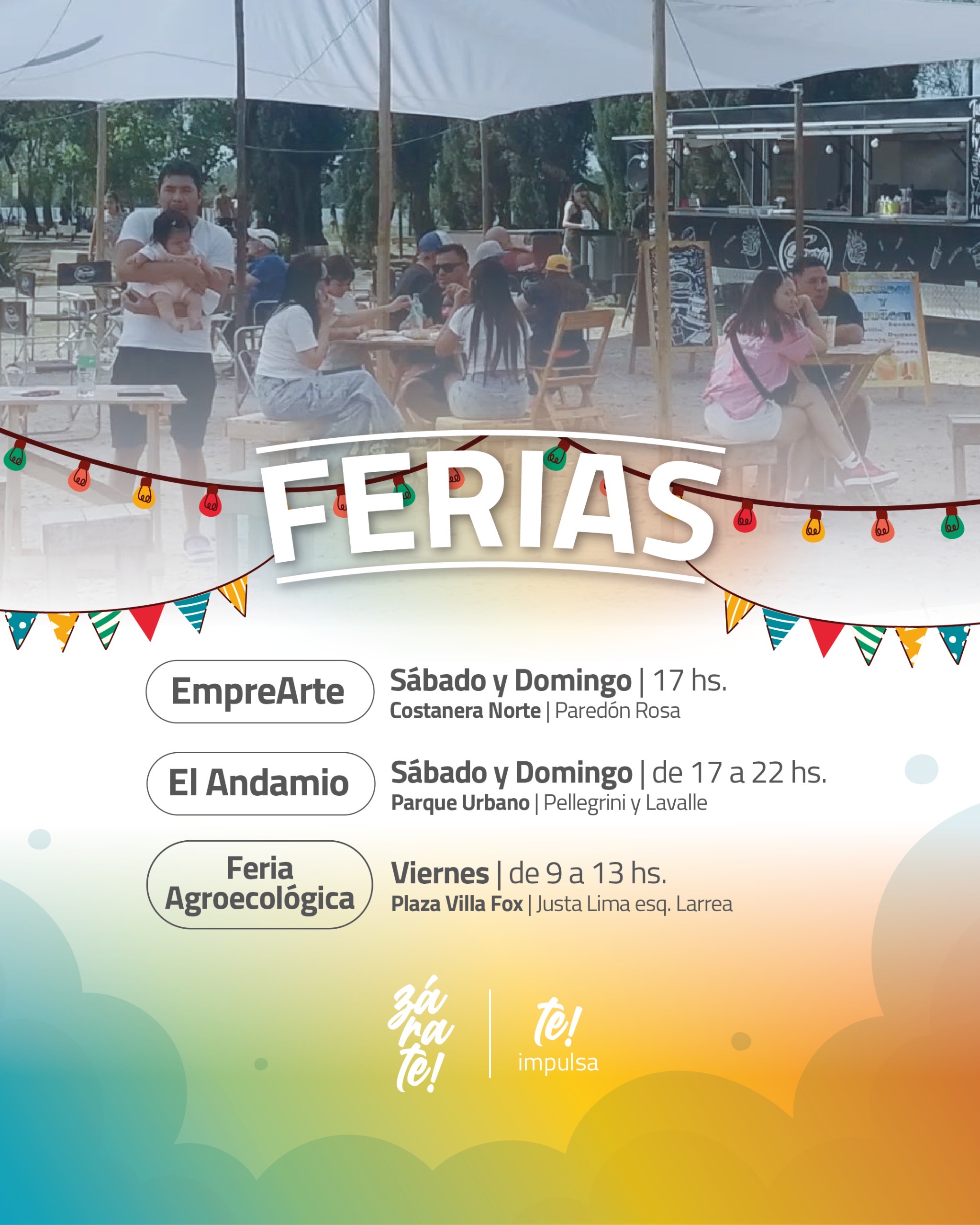 Este viernes de 9 a 13 hs se realizará la feria agroecológica en la plaza de Villa Fox y el fin de semana las ferias de emprendedores organizadas por El Andamio (sábado y domingo de 17 a 22 hs en el Parque Urbano) y EmpreArte (sábado y domingo a las 17 hs en Costanera Norte).