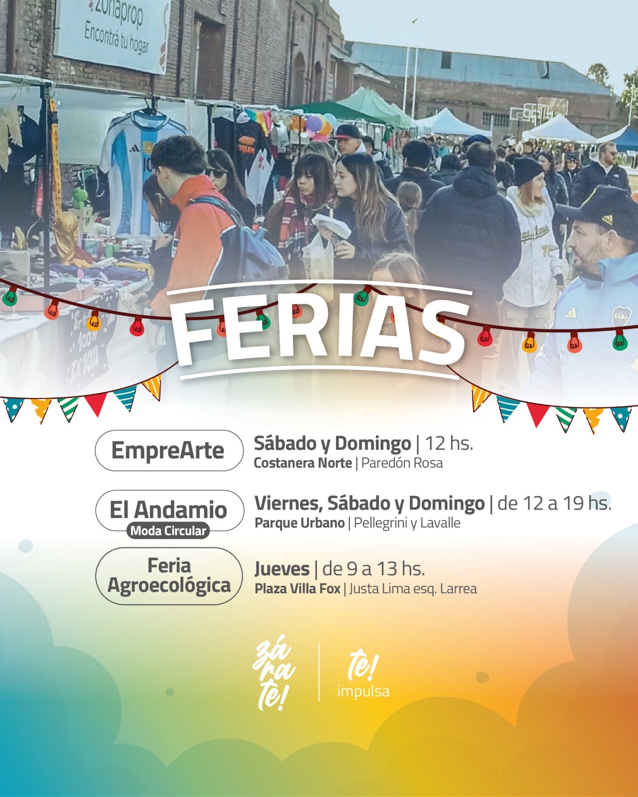 El jueves de 9 a 13 hs se realizará la feria agroecológica en la plaza de Villa Fox y el fin de semana las ferias de emprendedores organizadas por El Andamio (viernes, sábado y domingo de 12 a 19 hs en el Parque Urbano) y EmpreArte (sábado y domingo a las 12 hs en Costanera Norte).