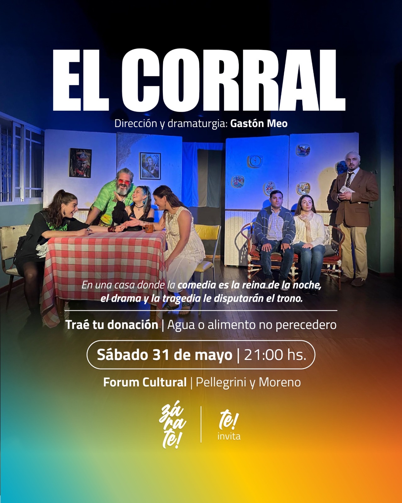 Con dirección y dramaturgia de Gastón Meo, la obra “El Corral” se presentará este sábado a las 21 hs en el Forum Cultural. Una historia de ex compañeros de escuela secundaria que se reencuentran después de 17 años para celebrar su egreso, donde en medio de tanto festejo recordar ciertas anécdotas los pueden dejar cara a cara con la muerte. Para el ingreso traer una donación de agua o alimento no perecedero.