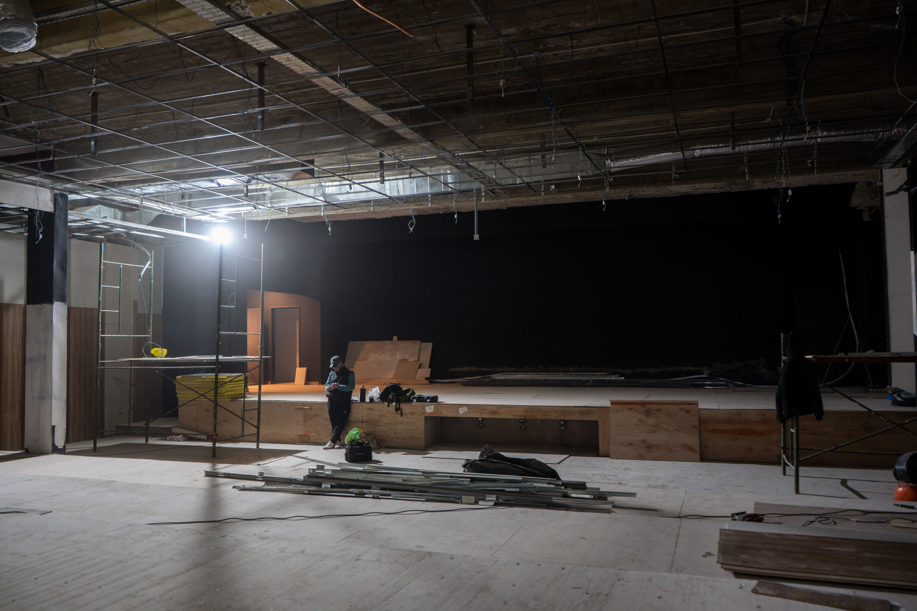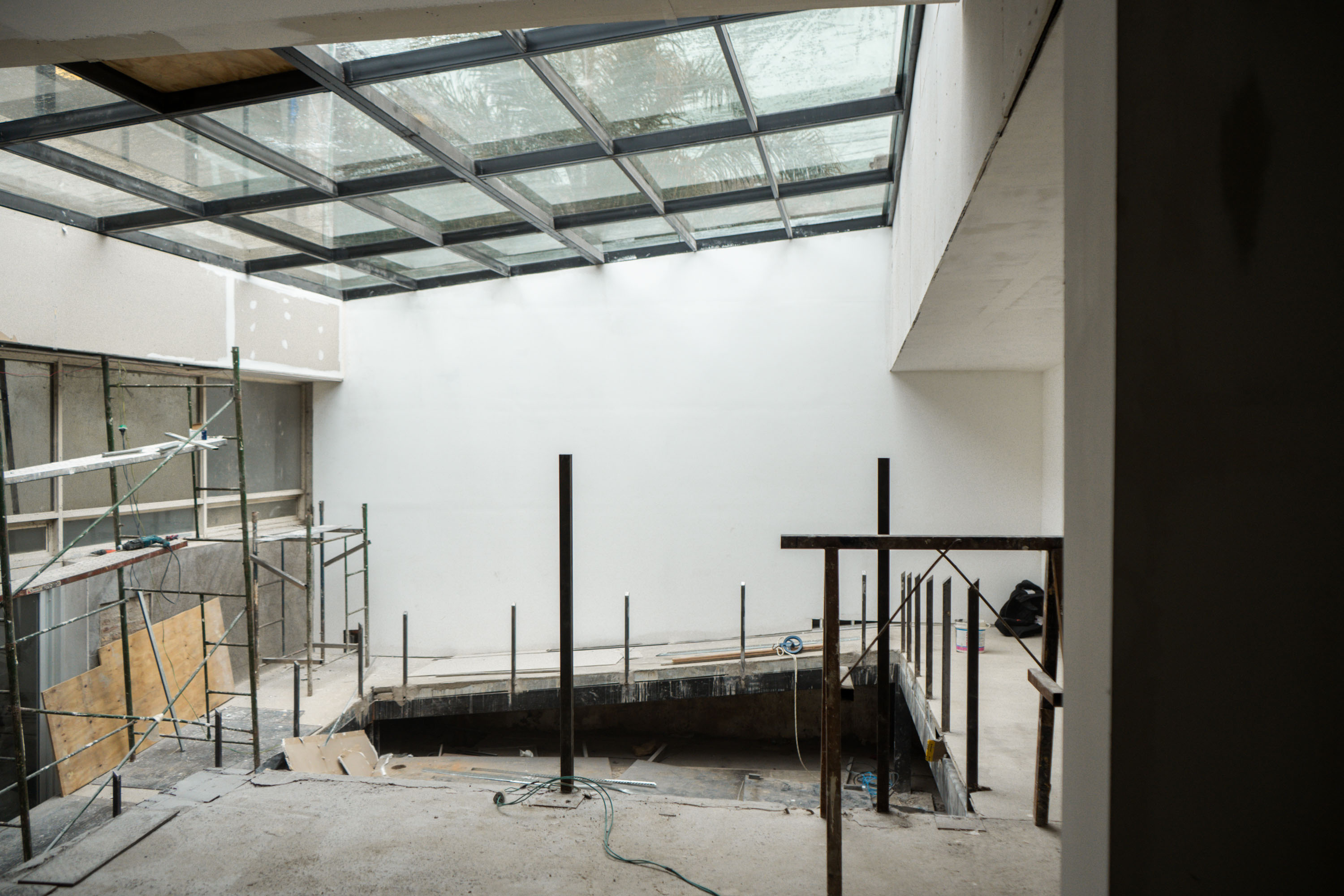 En el subsuelo se realiza el cambio del piso de madera; mientras que, en la sala principal, se lleva adelante las terminaciones de los laterales de las paredes y el armado del cielorraso. Previo a estos trabajos, se finalizó la instalación del techo de vidrio del hall de acceso al teatro.