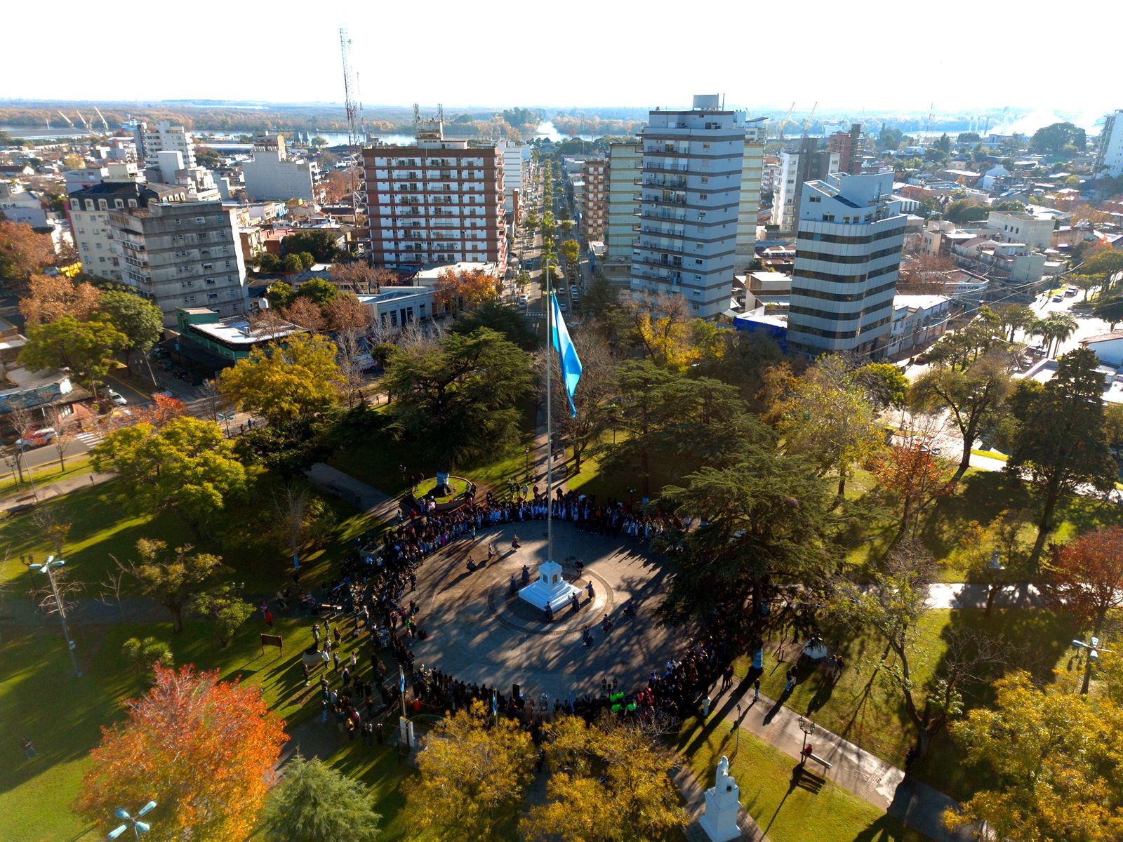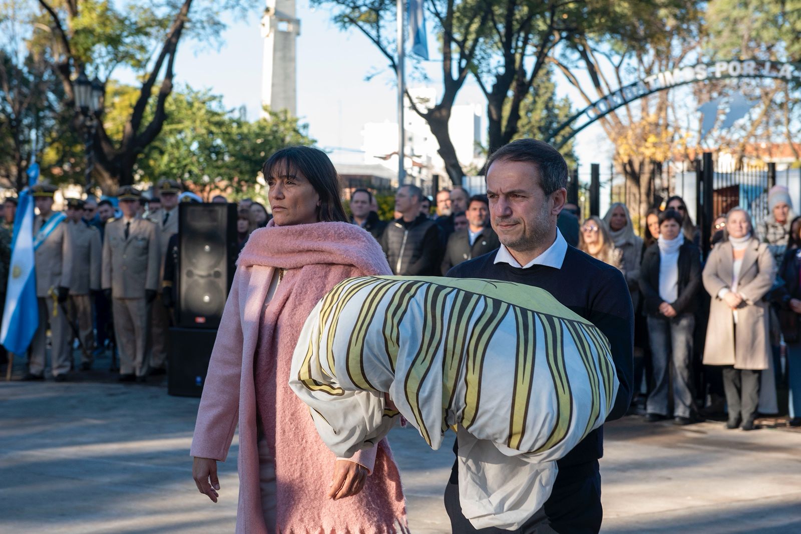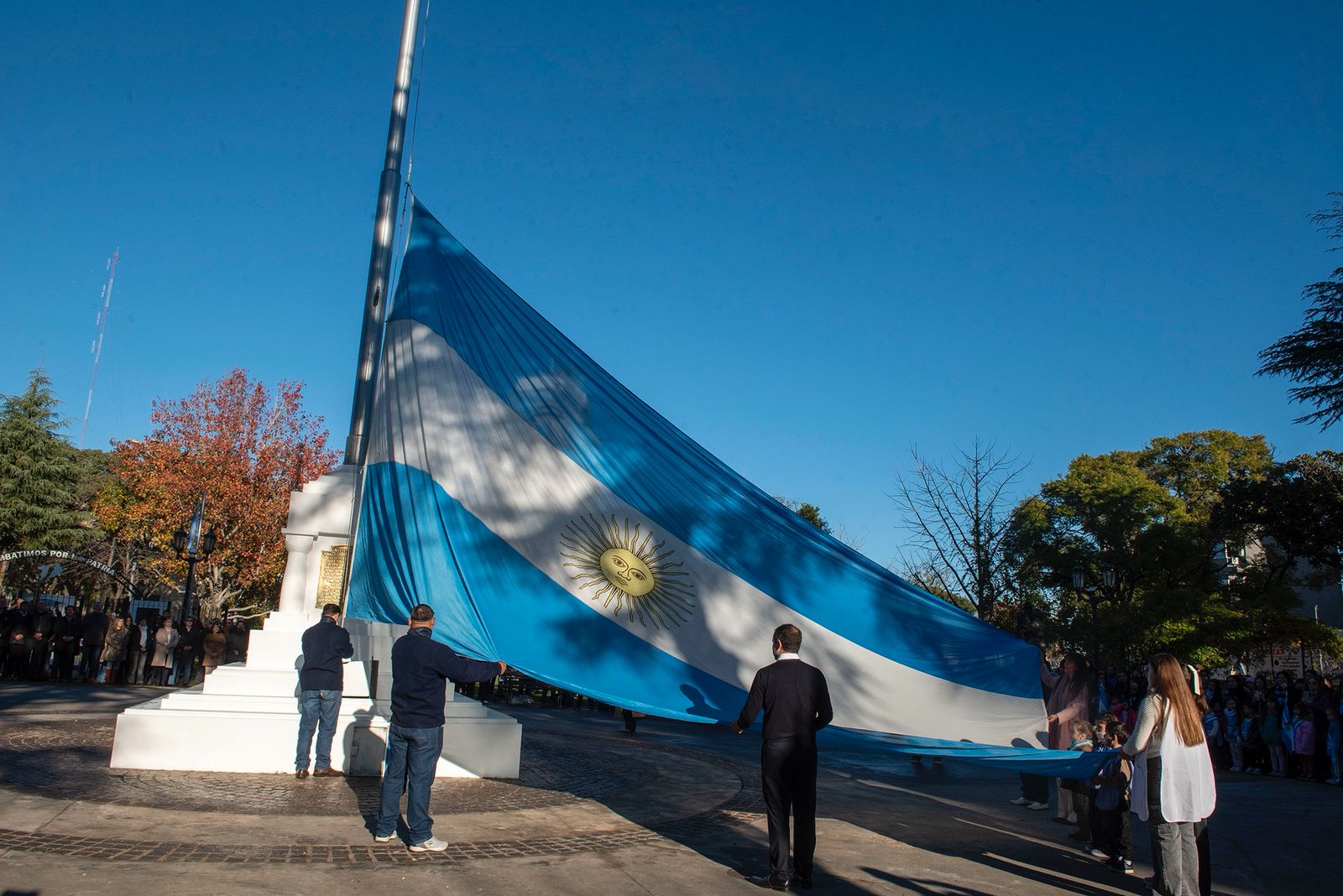 El intendente Sebastián Abella encabezó el emotivo acto y el izamiento de la bandera de 12 metros que hoy puede observarse desde el acceso a la ciudad. Tras la tormenta de febrero, la base del mástil fue restaurada respetando su antigua construcción y se le restituyeron las mismas placas que ya poseía.