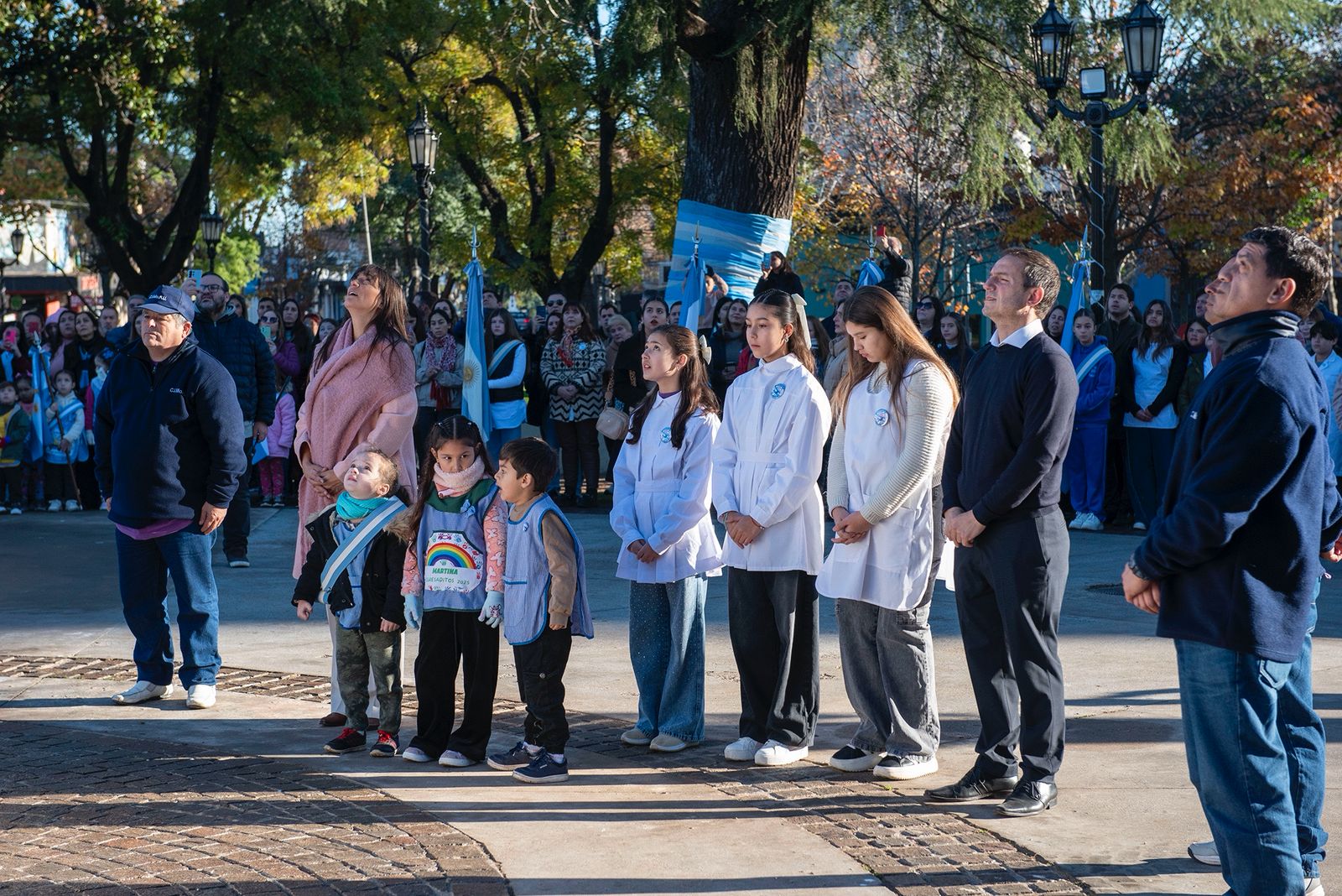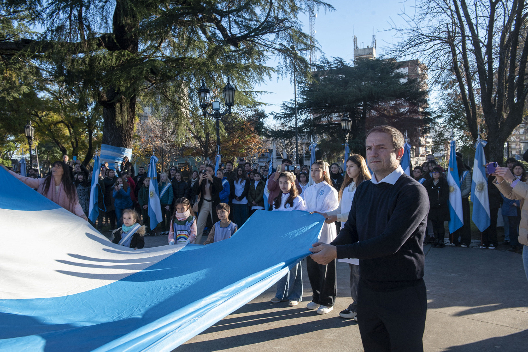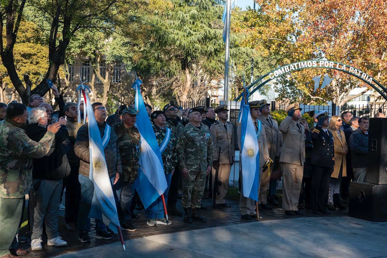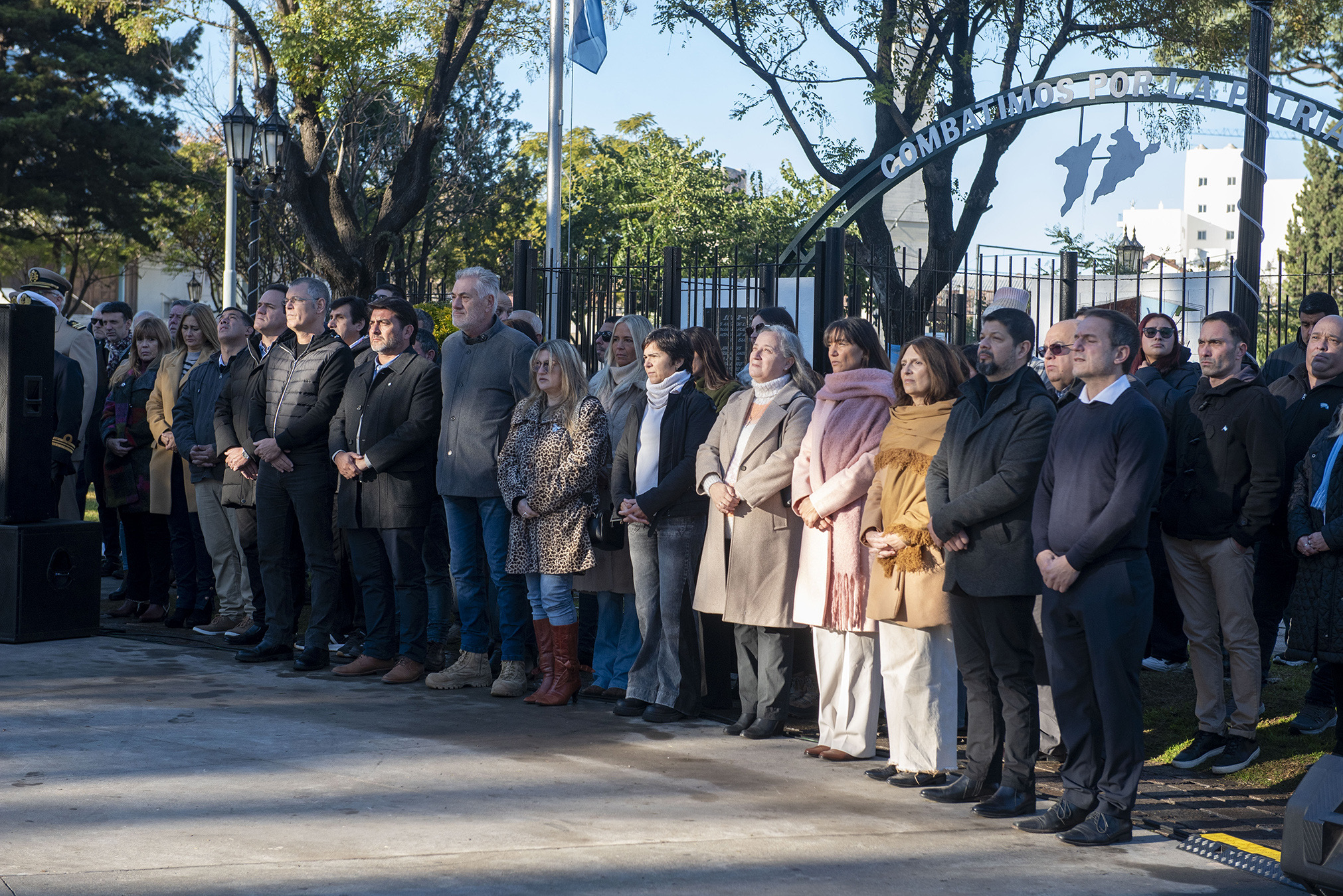 El acto fue encabezado por el intendente Sebastián Abella y contó también con la participación de la Presidenta del Honorable Concejo Deliberante, Karina Sala; el Jefe de Gabinete, Abel Sánchez Negrette; funcionarios municipales y autoridades educativas y de fuerzas de seguridad, además de Veteranos de Guerra, abanderados y escoltas de establecimientos educativos y una gran cantidad de vecinos.