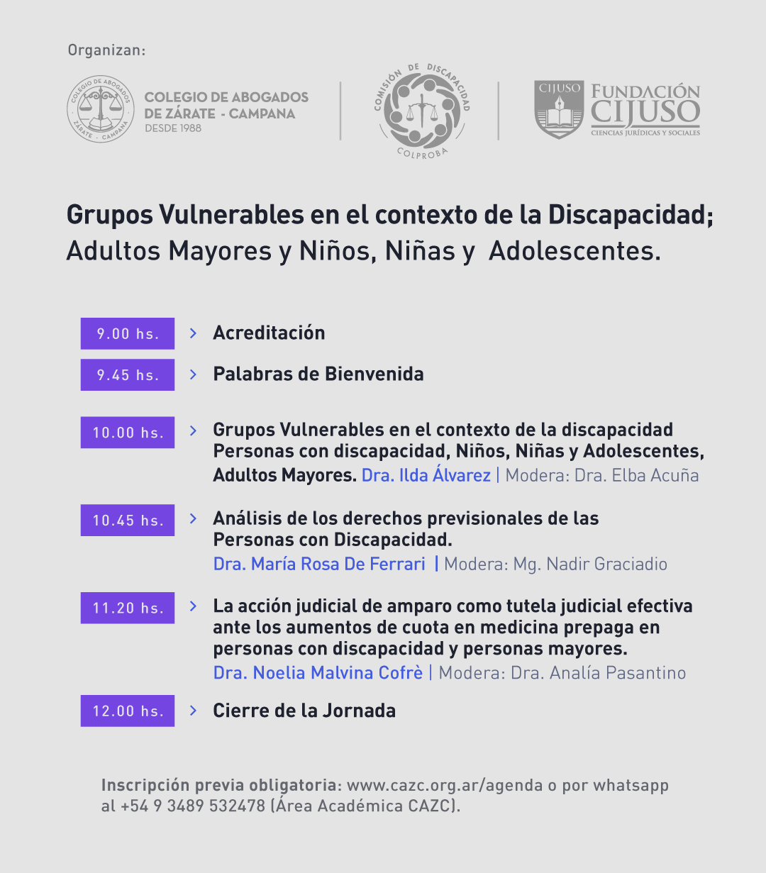 - 10:00 hs.- Grupos Vulnerables en el contexto de la discapacidad: Personas con discapacidad, Niños, Niñas y Adolescentes, Adultos Mayores.