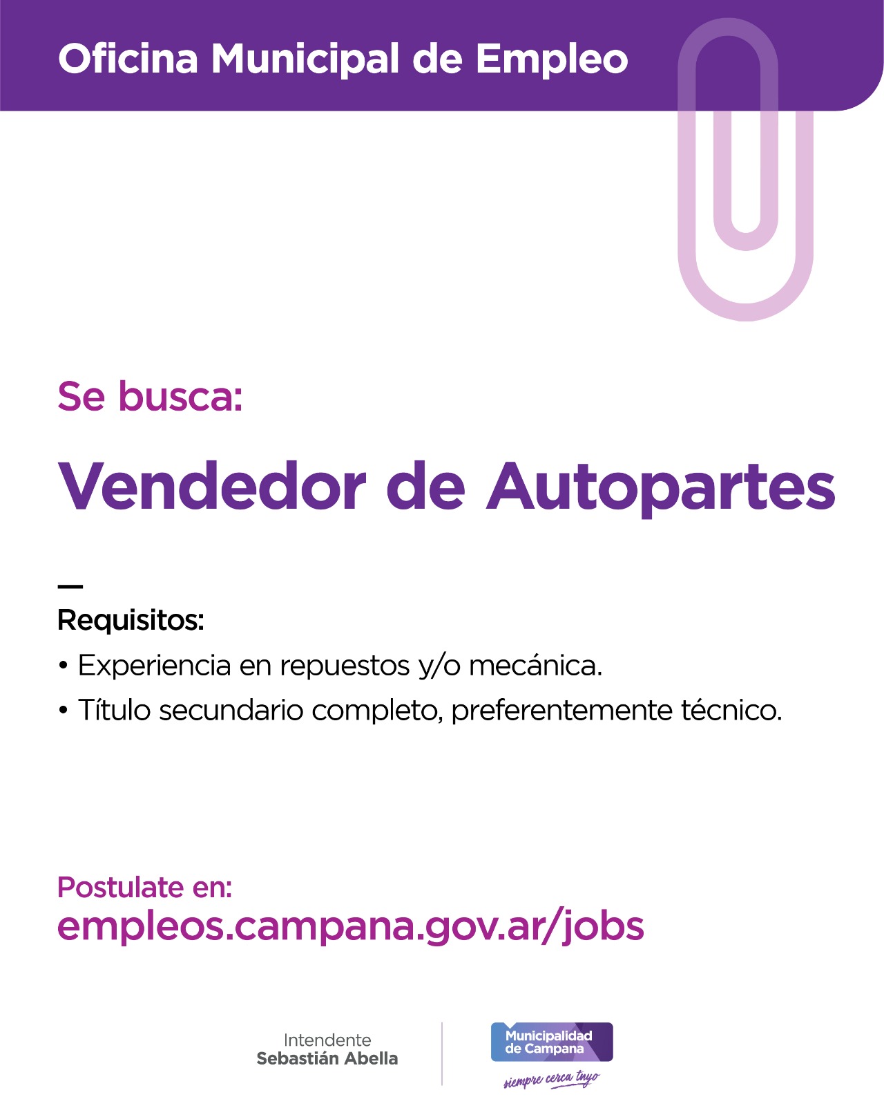 En esta oportunidad, se solicita Vendedor de autopartes y Administrativa. Las postulaciones deben realizarse a través del Portal de Empleo del Municipio de Campana.